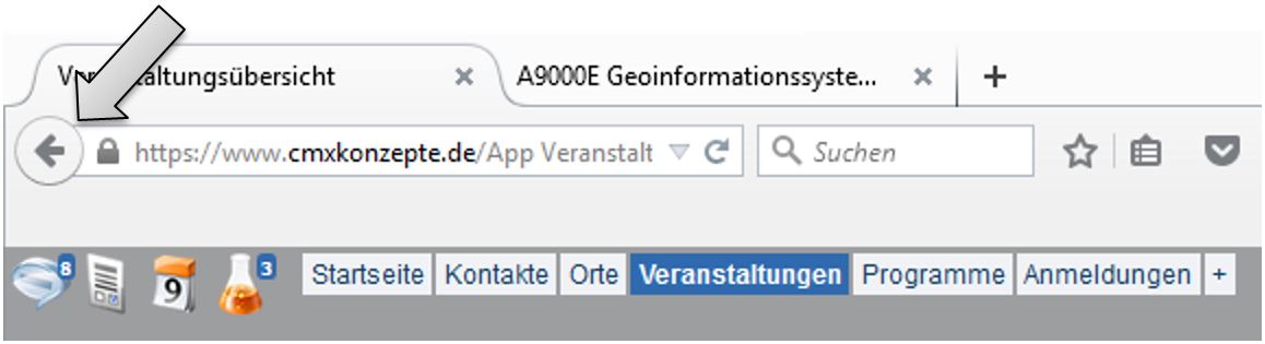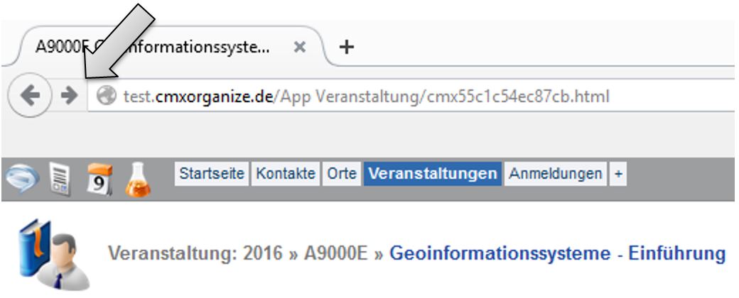 Mit dem Zurück-Button im Browser wechseln Sie von der aktuellen zur vorherigen Seite zurück. Wenn Sie z. B. in einer Veranstaltung eine Anmeldung erstellen, werden Sie direkt zur Anmeldung weitergeleitet. Mit einem Klick auf den Zurück-Button kommen Sie wieder zur Seite der Veranstaltung zurück.
