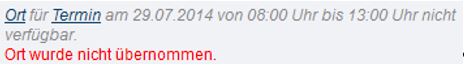 Eine Belegung des Ortes außerhalb der Verfügbarkeiten ist nicht möglich! Es erscheint beim Generieren von Terminen folgende Meldung: „Ort wurde nicht übernommen.