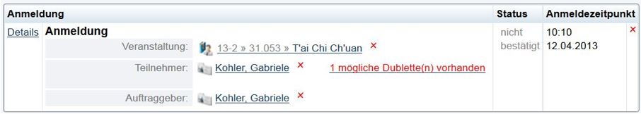 Ferner wird auf mögliche Dubletten direkt auf der Startseite in der Applikation „Anmeldung“ hingewiesen.
