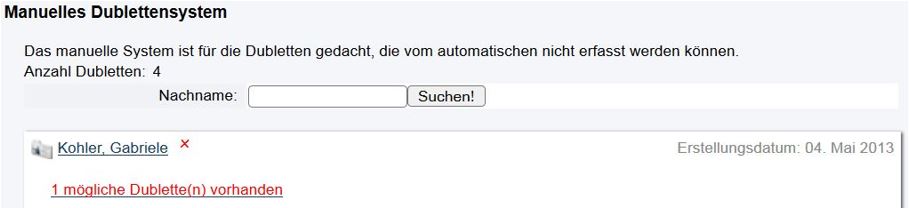 Auf mögliche Dubletten wird außerdem direkt auf der Startseite in der Applikation „Dubletten“ (beim manuellen Dublettensystem) hingewiesen.