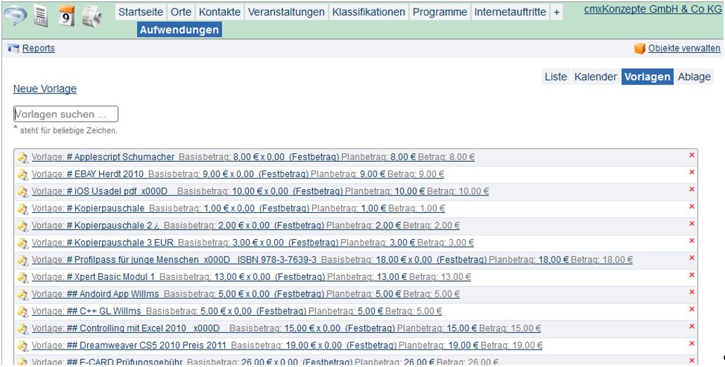 Wenn Sie das Objekt „Aufwendungen“ öffnen und dort den Reiter „Vorlagen“ anwählen, sehen Sie, welche Vorlagen für zu erstellende Aufwendungen bestehen.