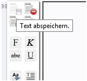 Auf der linken Seite des Editors finden Sie eine Symbolleiste. Diese enthält neben den Buttons „Text abspeichern“ und „Textverarbeitung abbrechen“ die Möglichkeit, Eingaben rückgängig zu machen oder diese zu wiederholen.