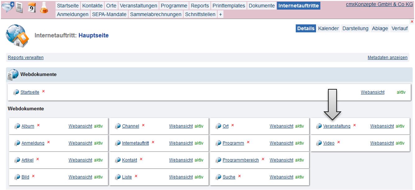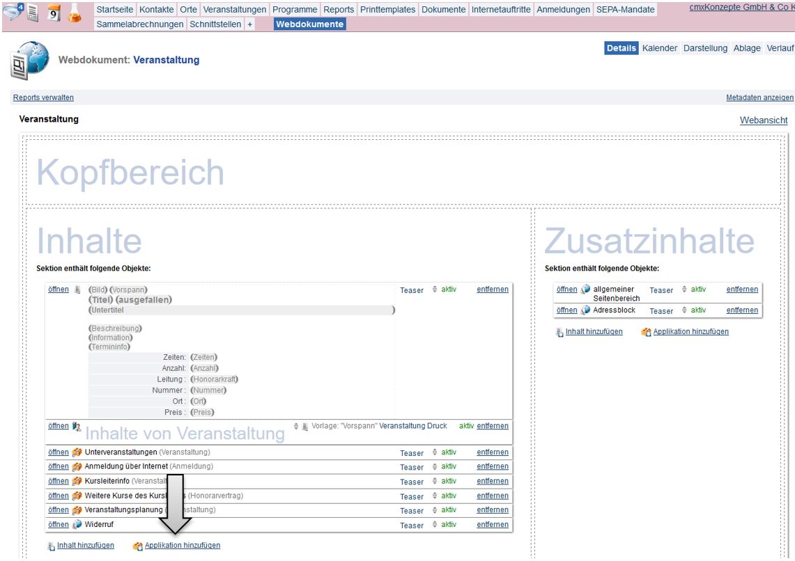 Um die Applikation hinzuzufügen, rufen Sie das Webdokument „Veranstaltung“ auf.