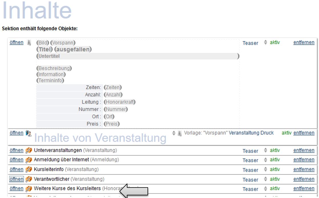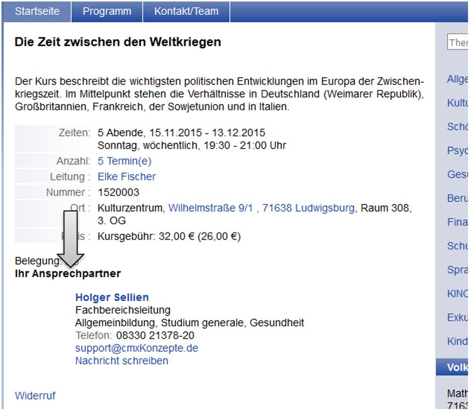 Werden die entsprechenden Personen unterhalb der Überschrift „Ihr Ansprechpartner“, „Fachbereichsleiter/in“ oder/und „Organisator/in“ zu jeder Veranstaltung angezeigt.
