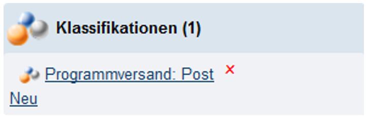 Erstellt man eine neue Klassifikation z.B. „Programmversand: Post“, wird der Name in das Feld „Neu“ eingegeben und danach durch einen Klick auf die Schaltfläche „speichern“ gespeichert.