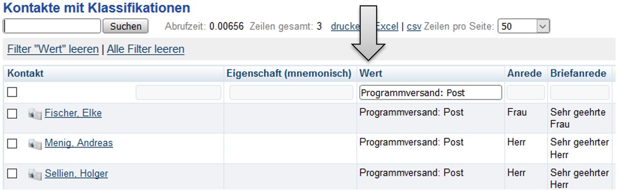 Im Filterfeld der Spalte „Wert“ wird der Name der Klassifikation eingegeben und danach Enter gedrückt.