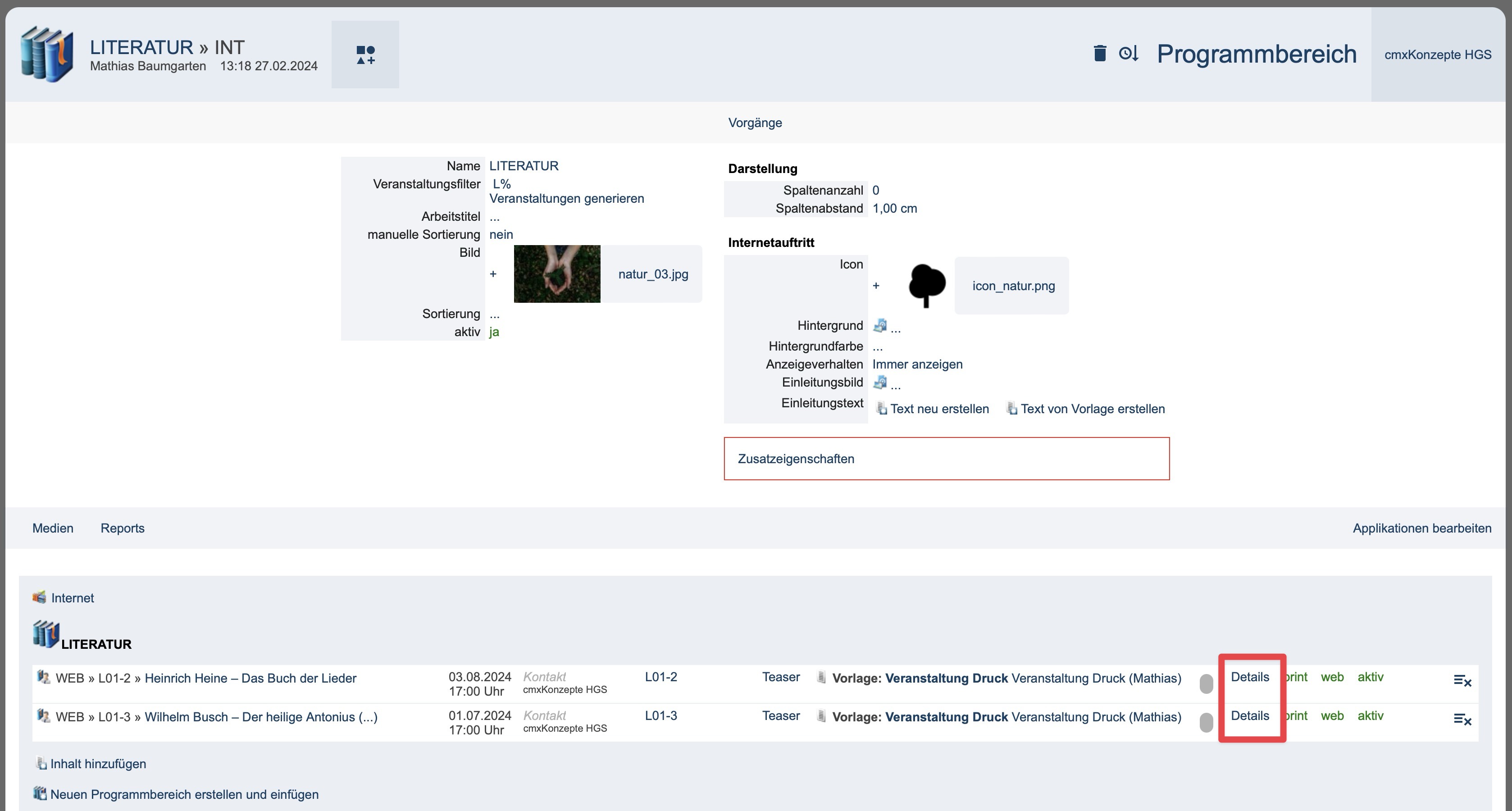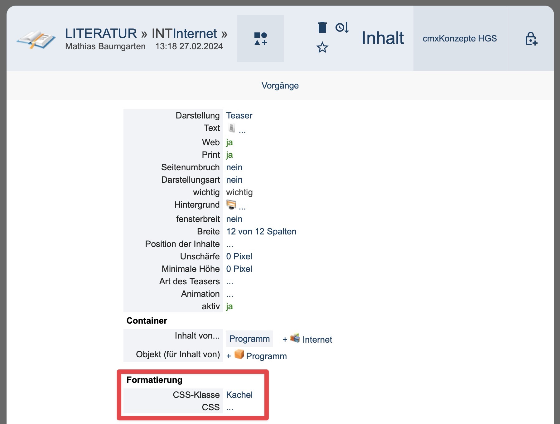 Um dies zu erreichen, klicken Sie auf den Link “Details” des Programmbereichs oder der Veranstaltung im Programm und tragen in das Attribut “CSS-Klasse” den Wert “Kachel” ein.