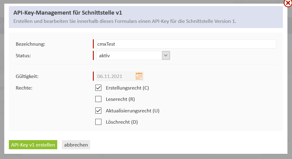 Unter "Bezeichnung" tragen Sie den Namen Ihrer Organisation ein und unter "Gültigkeit" das Datum, an dem der API-Key ablaufen soll (es muss daher immer in der Zukunft liegen). In der Rubrik "Rechte" wählen Sie die Optionen "Erstellungsrecht" und "Aktualisierungsrecht" aus. Anschließend bestätigen Sie die Aktion mit "AP-Key v1" erstellen.