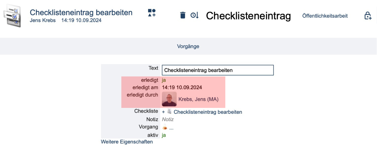 In der Detailansicht von Checklisteneinträgen wird die Erledigung protokolliert. Es ist ersichtlich, welcher Kontakt einen Checklisteneintrag auf "erledigt" gestellt (abgehakt) hat und wann diese Markierung gesetzt wurde.